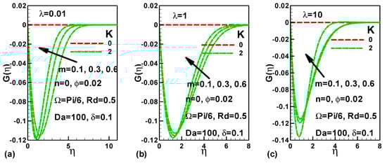 The effects of the pressure gradient parameter on the dimensionless microrotation are displayed in Figure 6a–c for Newtonian and micropolarnanofluid. As expected, for Newtonian fluid, the microrotation velocity is zero in all cases. The microrotation velocity shoots down in the negative direction close to the surface and recovers to satisfy the boundary condition. This happens in each case, and the maximum value of the shooting value depends upon the Richardson number.