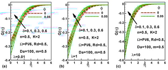 The effects of slip velocity and solid volume fraction on the microrotation velocity are illustrated in Figure 7a–c for a micropolar nanofluid with weak concentration. The microrotation velocity is minimum at the surface and increases up to the boundary layer. For the pure micropolar fluid, the microrotation velocity is the least and enhances with the solid volume fraction of nanoparticles. The velocity slip parameter also helps in enhancing the microrotation velocity inside the boundary layer. In free convection, the boundary layer thickness decreases due to the weak concentration of the micropolar nanofluid.