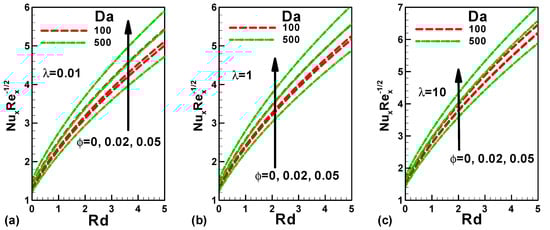 The variation of Nusselt number with slip and micropolar parameters is shown in Figure 10a for forced convection, in Figure 10b for mixed convection, and in Figure 10c for free convection. The range of Nusselt numbers includes Newtonian to micropolar fluids for two values of pressure gradient parameter. Both velocity slip and pressure gradient parameters help in enhancing the Nusselt number for each fluid. It is important to note that the Nusselt numbers for Newtonian fluids are the highest and decrease with the micropolar parameter. Variation of the Nusselt number with radiation and solid volume fraction of nanoparticles illustrated in Figure 11 for different values of the Darcy number. As expected, the Nusselt numbers increase with both radiation and solid volume fraction of nanoparticles. Due to the higher thermal conductivity of nanoparticles, the dimensionless heat transfer rate increases. Like nanoparticles, radiation also helps in the enhancement of the heat transfer rate of the micropolarnanofluid. The viscous effects increase with an increase in the Darcy number in a porous medium. Consequently, the thermal boundary layer thickness decreases, and the Nusselt number increases.