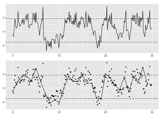 To better illustrate the contributions of this paper, including how this paper addresses a different problem from our recent work [], Figure 1 shows a sample trajectory of stochastic cusp catastrophe model with parameters . The upper plot is a sample trajectory assuming no missing values, and our recent work [] has addressed the statistical inference problem under this so-called “complete” observations settings. The lower plot is the same sample trajectory assuming missing values. In this paper, we focus on tackling the inference problem assuming missing values. Our solution is a Bayesian approach that naturally incorporates the missing values as parameters to be estimated, which is a one data augmented approach. Our simulation results implemented the Bayesian approach to cusp catastrophe model shows feasible solution by using only the observed observations.