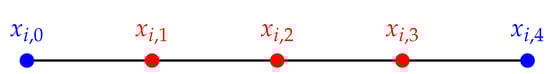 In the above plot, two endpoints in blue, namely and denote two consecutive observed data points. Further, there are three points in red, namely , and , representing unobserved data points. They are “synthetic” data in the sense that we do not have the actual observation, either because we were not able to do so, or we just simply did not do so, but these three data points have been generated at those time points.