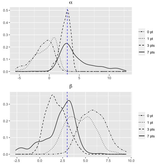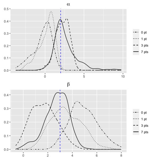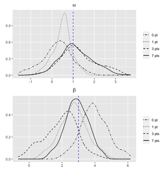 Additionally, we are providing the distributions of posterior MAP estimators as shown in Figure 3, Figure 4 and Figure 5. The results in Table 3 can be further graphically illustrated in Figure 3 for parameters and , Figure 4 for parameters and , and Figure 5 for parameters and . The distributions in each figure are generated from M = 500 simulations for their posterior mode used in Table 3. As seen from these figures, we observe that as the number of augmented points increase (to 7), the distribution of the estimated and are less biased to the true values (as shown in the vertical dashed lines).