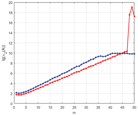 As can be seen from Examples 1,2, conditionality is highly dependent on the signal-to-noise ratios upon input and output. Let us investigate how the condition number changes with a change in the signal-to-noise ratio upon input and output. Upon output, there is a signal–noise ratio of , while there is a signal-to-noise ratio upon input of . Figure 2 shows and . As can be seen from Figure 6, the conditionality of the proposed system is lower than the conditionality of the system (8).