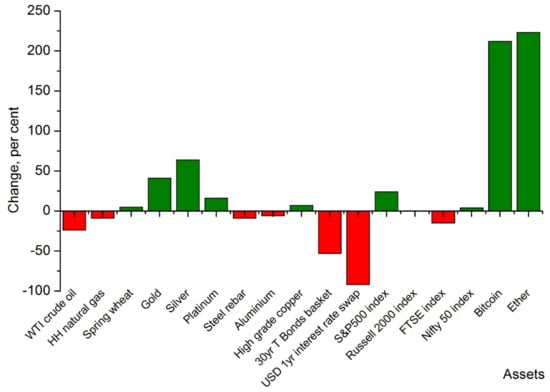 Relative change in price of different assets: energy resources; grains; precious, ferrous and non-ferrous metals; bonds; interest rate swaps; several world stock indices; and cryptocurrencies, since February 2019 till September 2020 (the end of the first wave of the COVID-19 pandemic). The data are taken from the following sources: New York Mercantile Exchange; Chicago Board of Trade; London Bullion Market; Singapore Exchange; London Metal Exchange; BrokerTec; London Clearing House LCH ClearNet; Chicago Mercantile Exchange; Intercontinental Exchange; National Stock Exchange of India; and several cryptocurrency exchanges.