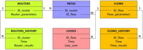 For router and flow parameters, we defined the ROUTERS and FLOWS table. They stored the values of the current step (q, x, p, W, R, l, N) and fixed parameters (C, , , , w, T). The previous steps were collected in the ROUTERS_HISTORY and FLOWS_HISTORY tables. For each flow, the loss values were saved into the LOSSES table. This table acted as a table with current and historical data. The structures of the network were preserved in the PATHS table.