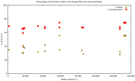 We have additionally collected the idle time statistics for the most prolonged flow in the network (42 nodes) for the whole modeling period. The visualization in Figure 4 shows the difference of idle time between the two types of nodes, which varies between +18.8% and +40.6%.