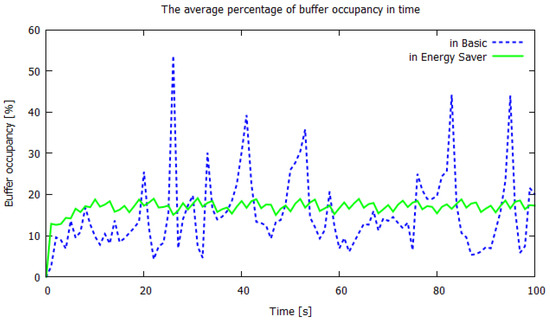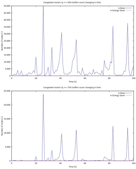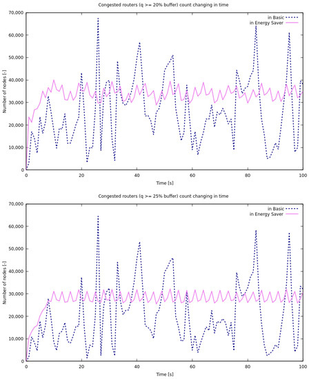 The initial values of queue lengths were set to zero, and the initial sizes of the congestion windows were set to one. The nodes were not homogeneous; their parameters were chosen based on the volume of traffic they transmitted. The buffer volume (maximum queue) B was in the range packets, and the speed of node packets/s. In energy-saving mode, we set the C-disabling thresholds to 20% of B and to 25% of B. The rest of the parameters remained the same as in normal mode. All presented results are based on the samples collected for each second of modeling time.
