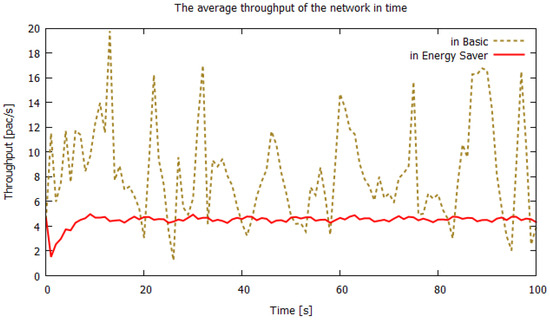 Average throughput per link in the network as a function of time for basic and energy-saving models.