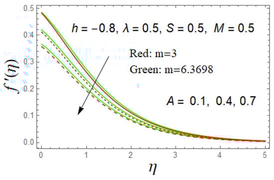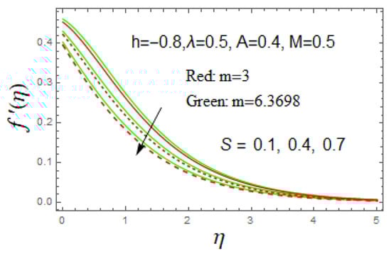 Solutions of the Equations (6) and (7) with the boundary conditions shown in Equation (8) are analytically computed using the HAM method in Mathematica software. The appropriate initial guess, boundary conditions and different values of parameters need to be chosen and well-adjusted in the coding of the HAM method to calculate the foremost exact outcomes. We considered the stretching () and shrinking () sheets. The Prandtl number for alumina is fixed in the present study, which is , while the other parameters, such as velocity and thermal slips, heat generation and suction , are set to be vary with the purpose to study their influence on the fluid flow and heat transmission.