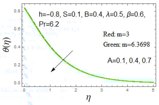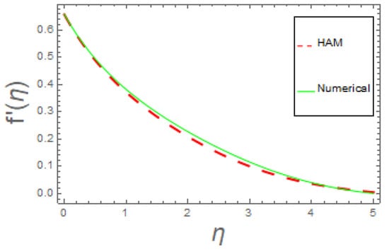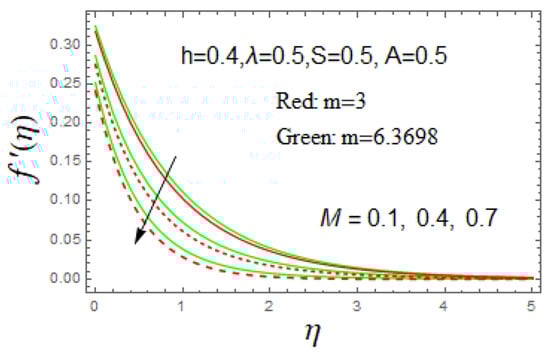 Figure 6 illustrates the influence of the magnetic parameter on the velocity field . It is revealed that the velocity of the fluid declined due to enhancement in magnetic parameters. The reality behind this is the application of a crosswise magnetic field, which leads to that of a drag force comparable to that of Lorentz, which shows up a resistance in the fluid flow, and as a result, it reduces the velocity of the fluid.