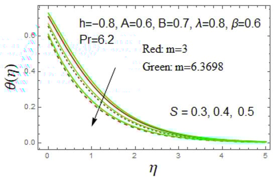 Figure 7 and Figure 8 show the impact of on and , respectively. It is noted that when rises, the fluid velocity and temperature slow down. A comparison of the results shown in Figure 6 clearly indicates that the effect of the slip parameter on velocity and temperature is quite similar to the effect of the magnetic parameter. Therefore, it is clear from the above-mentioned example that the combination of partial slip, magnetic effect and mass transfer has a great influence on the fluid flow and temperature.