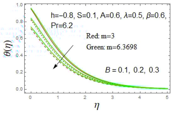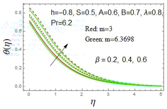 In Figure 9 and Figure 10, the influences of the thermal slip parameter and heat generation parameter over the temperature profile are portrayed. Since these parameters do not affect the velocity profile , it is only necessary to provide the temperature profile in this present study. The temperature profile rises when the thermal slip parameter B decreases or the heat generation parameter β increases. The appropriate amounts of thermal slip and heat generation parameters need to be controlled to obtain the required heat transfer performance, as both parameters produce a different impact that could offset each other.