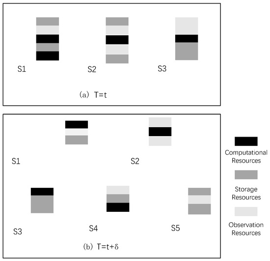 As shown in Figure 3a shows that there are three satellites that have received the resource request sent by the ground station or other satellites at a slot t, where represents the set of satellites that have received resource requests in the spatial information network. The gray squares in the queue represent the number of storage resources requested, the white squares represent the number of observation resources required, and the black squares represent the number of computing resources needed. Figure 3b shows the state in which the satellite set S redistributes all received resource requests at a time and cooperates with neighboring satellites to share the resource request pressure, where the time interval satisfies at this time . The satellite set includes the original satellite set S and other satellite sets that are coordinated. Each satellite in the satellite set is allocated a certain amount of resource request operations according to the number and status of satellite resources. From the satellite state figure at the time , it can be seen that the number of resource request operations on the original satellite set S has been reduced, and the resource type has become more singular. In contrast, the idle satellite set has obtained a certain number of resource request operations.
