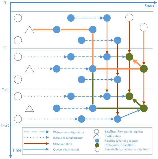 In order to clearly describe the specific process of resource request queue reconstruction and unified planning, we use spatio-temporal axes to represent the satellite spatio-temporal variation [26]. Figure 4 is an example of the data transmission process of multi-satellite resource request queue reallocation. The satellite set is the resource request sent by the ground base station or surrounding satellites, and the satellite set is the surrounding satellite set .