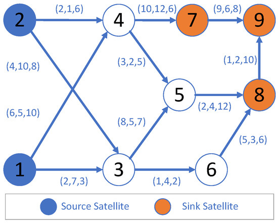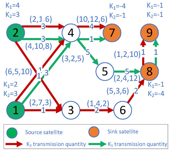 As shown in Figure 5, we can observe the inter-satellite links and the satellites’ initial state in the spatial information network. Our purpose is to find all paths that consume the shortest time.