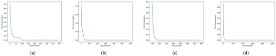 GA solution process based on different parameter settings. (a) GA process based on parameter P1, (b) GA process based on parameter P2, (c) GA process based on parameter P3, (d) GA process based on parameter P4.