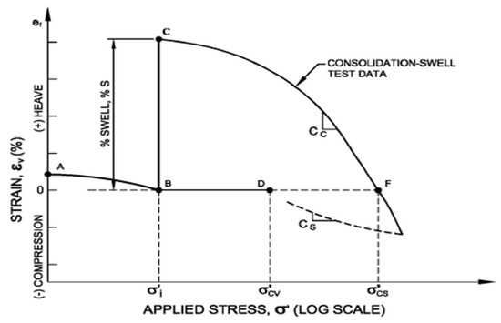 The expansive properties of high plastic clays were identified by measuring both the free swelling and swelling pressure. The free swelling index is 33–130%. On the other hand, the swelling pressure values range between 1.1 and 4.1 MPa. Meanwhile, the swelling index values are very close to each other, ranging from 0.112 to 0.117, and this reflects the homogeneity of the high plastic clay soil. The swelling index (Cs) and void ratio (e) average values are 0.115 and 0.923, respectively (Figure 5).