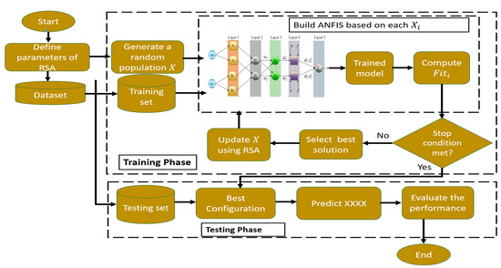 Figure 3 depicts the framework of the developed model to predict the swelling potentiality. In general, the developed approach is based on improving the performance of ANFIS based on the operators of the RSA algorithm that is used to identify the appropriate ANFIS parameters. The initial stage in the RSA-ANFIS is to preprocess the data by splitting it into two sets: training (70%) and testing (30%). The next stage is to create initial configurations that reflect the RSA population, with each configuration based on ANFIS settings. Then, the quality of each configuration () is evaluated by computing the following fitness value () that is defined as the root mean square error (RMSE).