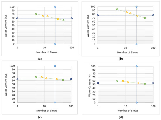 Flow curve of liquid limit (WL) test results (examples a–d) for high plastic samples (CH) of shallow marine clays according to ASTM D 4318, 2010.