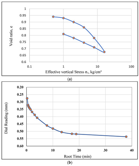 (a) Void ratio vs. log P curve and (b) Compression-square root time curve of representative sample.