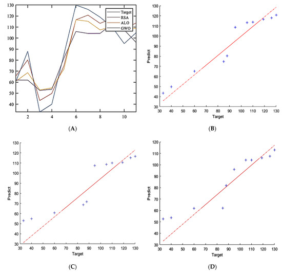 The predicted value obtained by RSA-ANFIS, ALO-ANFIS, and GWO -ANFIS using swelling pressure (Target). (A) Predicted values using the three algorithms and measured data, (B) QQ-plot for RSA-ANFIS, (C) QQ-plot for ALO-ANFIS, (D) QQ-plot for GWO-ANFIS.