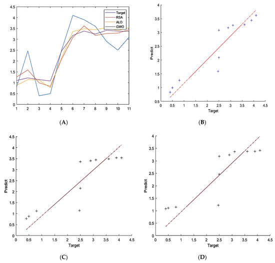 The predicted value obtained by RSA-ANFIS, ALO-ANFIS, and GWO-ANFIS using the Free Swelling Index (Target). (A) Predicted values using the three algorithms and measured data, (B) QQ-plot for RSA-ANFIS, (C) QQ-plot for ALO-ANFIS, (D) QQ-plot for GWO-ANFIS.