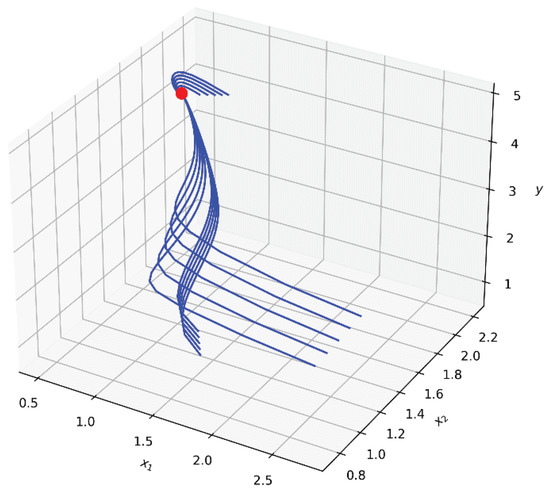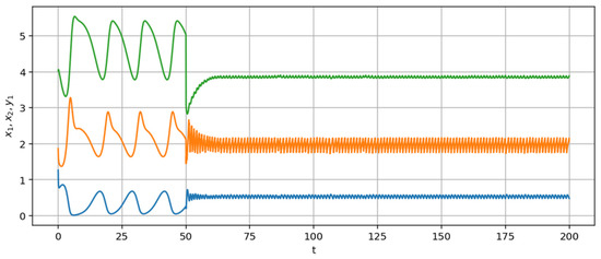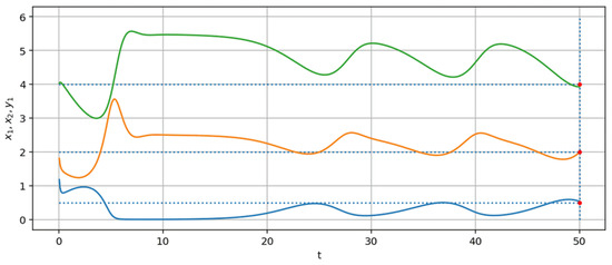 To train a neural network and perform computational experiments, software is developed by the aid of Python 3. The original implementation of the neural network computing module on the basis of Numpy mathematical package is used. We consider the activation of neural network control at . Training is carried out for equilibrium state . The trajectories of the system (13) at are shown in Figure 9.