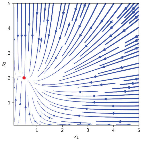 In Figure 1 and Figure 2, we marked the state of equilibrium , corresponding to the selected set of parameters by the red dot. It should be highlighted that this equilibrium state is a stable node with permanent coexistence. It is possible to obtain another type of phase portrait with a stable state of equilibrium by changing the form of the criterion (3).