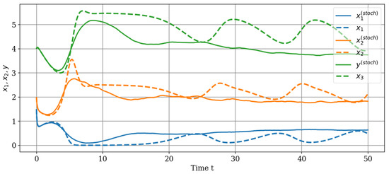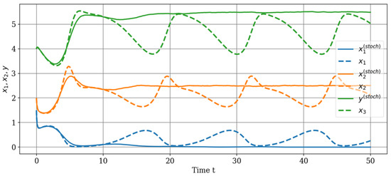 For the numerical analysis of the obtained stochastic model, we consider the time interval [0, 50]. The choice of parameters is consistent with the choice of parameters for the deterministic model (2). Figure 6 shows the trajectories of the stochastic model in comparison with the trajectories of the deterministic model (2).