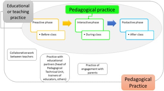 - The notion of EP adopted herein is one that boils down not just to teaching, but that includes three phases: pre-active, interactive and post-active, each one corresponding to the actions of the teacher—for teaching—before, during and after the class [1,6]. These practices refer to the set of tasks that comprise the teacher’s work; that is, the actions that the teacher takes—before, during and after the teaching activity—to convey the content to be taught [4].