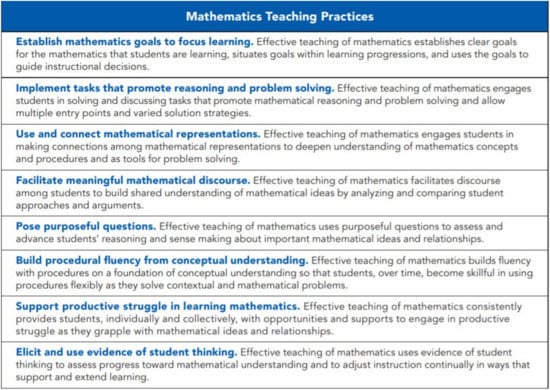 - NCTM. From Principles to Action. To Ensure Mathematical Success for All; The National Council of Teachers of Mathematics: Reston, VA, USA, 2014. [Google Scholar]