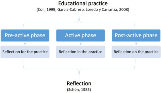 An approach to the training of professionals is carried out by [22], aimed at developing this capacity for “reflection-in-and-on-action”, which is the most appropriate, in his opinion, to help future and in-service professionals to confidently and proficiently confront the issues and problems that, in a complex and unpredictable way, arise in everyday practice (issues that characterize the complexity of teaching practice). These ideas of reflection in and on practice have had a great impact on education, where the notions of reflection for, in and on practice stand out. These three concepts are related to EP through its pre-active, active and post-active phases, as shown in Figure 3.