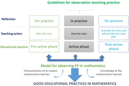 In the pre-active phase, the teacher is expected to reflect on the practice, inquiring about potential errors and problems that may arise in the classroom. In the active phase, reflection in action is expected, where the teacher brings their expertise to bear in order to cope with contingencies. In the post-active phase, the teacher can make decisions for another intervention or for subsequent classes. Given the relationship between professionalism and reflection [23,24], observing a good EP in mathematics requires observing the characteristics of a reflective mathematics teacher. In this regard, ref. [25] posit that reflective mathematics teachers are capable of: