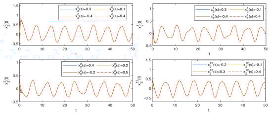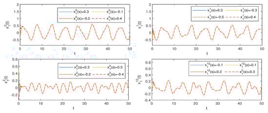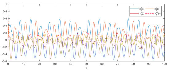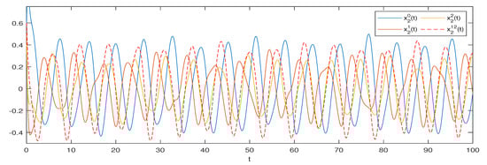 and . Hence, conditions (H1)–(H3) of are verified. Consequently, by Theorem 2, system (1) possesses a unique one pseudo almost periodic solution that is globally attractive (see Figure 1, Figure 2, Figure 3 and Figure 4).