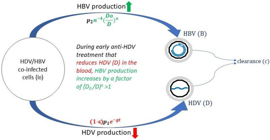 Based on newly published empirical results [15], we present a new mathematical model for the interaction between HBV and HDV that can explain the coinfection pattern of HBV increasing as HDV decreases. A schematic diagram for the model is depicted in Figure 1.