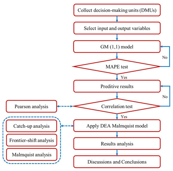 The research process (Figure 1) of the paper is described as follows. (Step 1) Choosing DMUs and collect relevant data: This step focuses on selecting the top DMUs in Vietnamese real estate companies and collecting their relevant information on the stock market from 2015 to 2018. (Step 2) Choosing input/output factors: Choosing inputs and outputs is an important step in applying the DEA model. This paper considered three inputs (total assets, cost of sales, cost of goods sold) and two outputs (total revenue, gross profit). (Step 3) Grey prediction: In this step, GM (1,1) is used to predict future data of inputs and outputs of DMUs. (Step 4) Checking forecasting accuracy: MAPE is used to check the predicted accuracy of GM (1,1). (Step 5) Pearson correlation test: The Pearson correlation method is used to check if the correlation coefficients between input and output factors are all positive correlation. (Step 6) DEA Malmquist model: The DEA method has different models each with different functions. MPI is used as the selected model to assess the changes in efficiency and performance in two periods: 2015–2018 and 2019–2022. (Step 7) Conclusion: The findings and summaries of the results from the proposed model are presented.