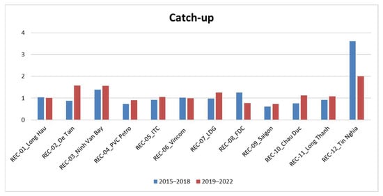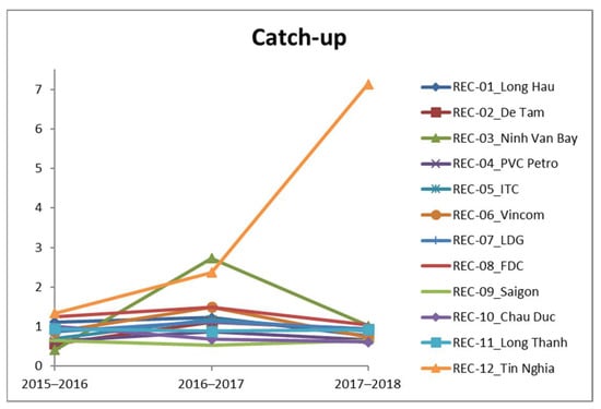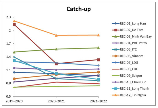 The ratio of technical efficiency in period t to t + 1 is called the catch-up effect, while the frontier-shift effect is based on the technological efficiency in period t to t + 1.