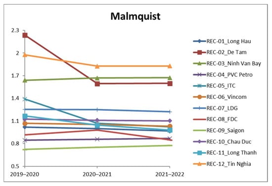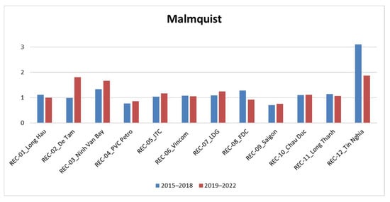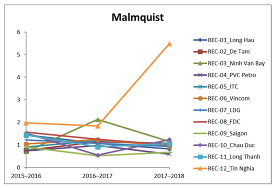 In brief, the identification and analysis of operational efficiency is a crucial task of managers in the market economy, which helps businesses to avoid losses in assets and capital and helps the sustainable growth of the economy. The information from this analysis will provide every audience inside and outside the business to make strategic decisions for each different purpose. In today’s economy, which is integrating and developing deeply with many unusual changes, it becomes more and more necessary to evaluate the performance of real estate businesses. In particular, in the sensitive business sectors such as the real estate market, the stock market, the information from the analysis and identification of financial signs is vital for businesses in general and listed real estate enterprises on Vietnam’s stock market in particular. In this paper, the researcher would like to introduce an overview of the current real estate industry so that entrepreneurs can identify opportunities and challenges to improve their business performance. The researcher will evaluate the business performance of the top 12 large real estate enterprises considered as Decision-Making Units (DMUs). These DMUs were screened by using Data Envelopment Analysis (DEA) method, the so-called DEA Malmquist model, and were listed on the stock market from 2015 to 2018 in Ho Chi Minh City, Vietnam, to help investors make the right decisions and ensure they would receive additional value from their investment. Grey theory, GM (1,1), is used to forecast the future data of DMUs and is applied as the input to the Malmquist model to assess the performance of these businesses in the future using the data from 2019–2022.