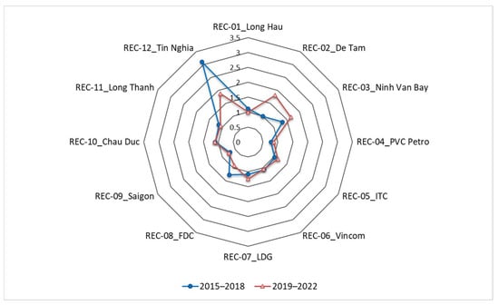 Therefore, replacing the values of k in the above formula, we can predict the data for REC-12 (Tin Nghia), e.g., (I) Total assets as shown in Table 4. Other factors are calculated as the same procedures. All predicted values of input and output factors for the period from 2019 to 2022 are shown in Table A5, Table A6, Table A7 and Table A8.