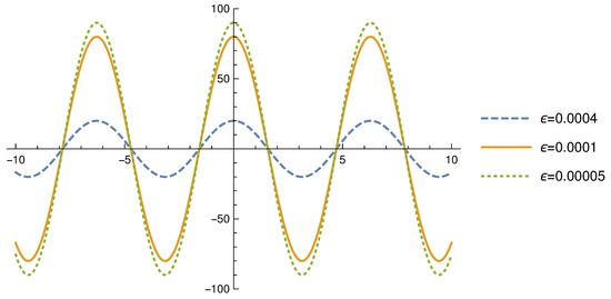 In Figure 1, we show the graphical representation of the correlation function, , given in the expression (34) for different values of ϵ. We can see the higher the perturbation ϵ, the lower the variability. This graphical behavior is in full agreement with the physical interpretation of the oscillator dynamics. Indeed, let us rewrite Equation (31) as follows,