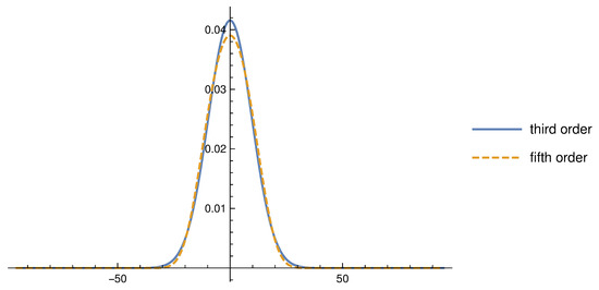 Approximation of PDF, , using until the third and the fifth order moment for via the PME. Example 2.