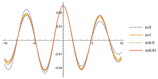 In Figure 3, we show the plot of the correlation function, , given in the expression (38) for different values of ϵ satisfying the weaker and the stronger bounds previously determined. We can observe that for smaller values of ϵ the obtained approximation of the correlation function better preserves the symmetry as expected.
