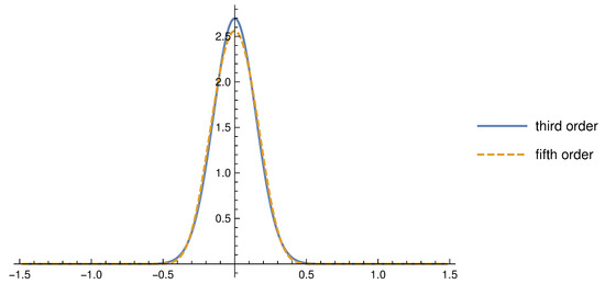 For the approximation of the PDF, , we apply the results exhibited in Section 4 based on PME by taking , which satisfies the stronger bound previously determined (). We first compute the approximation based on the three first moments