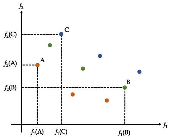 Figure 1 is a solution distribution under two-dimensional objective space, where all points represent solutions. For a minimal optimization problem, it can be seen that the point A is smaller than the point C under the two-dimensional objective space, that is, there is a dominance relationship between the point A and the point C, and the point C is dominated the point A. For the points A and B in Figure 1, we can see that the point A is greater than the point B on the axis, but the point A is less than B on the axis, so there is not a dominance relationship between the point A and the point B.