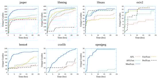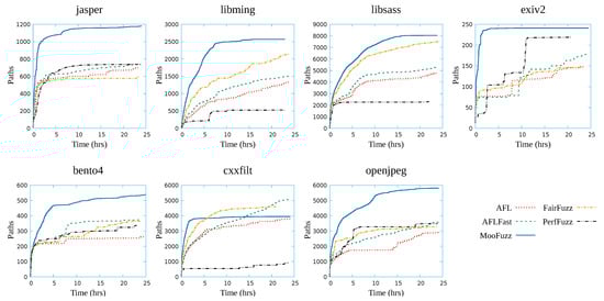 We design and implement our prototype by extending American Fuzzy Lop (AFL) [], and evaluate it against for popular fuzzers AFL, AFLFast, FairFuzz, and PerfFuzz in terms of path discovery and bug detection. We conduct our evaluation on seven real-world applications. The experimental results demonstrate that MooFuzz performs better than others. Compared with AFL, AFLFast, Fairfuzz, and PerfFuzz, it triggers 46%, 32%, 34%, and 153% more crashes with almost the same execution time, respectively. Furthermore, we run cases and analyze the discovery of vulnerabilities. MooFuzz is able to trigger stack overflow, heap overflow, null pointer dereference, and memory leaks related vulnerabilities.