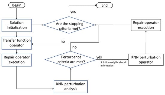 This section details the binary KNN perturbation algorithm to solve the SCP. This hybrid algorithm has 4 main operators: A solution initialization operator which is described in Section 4.1. A binarization operator which uses transfer functions to perform the binarization. This operator is detailed in Section 4.4. The perturbation operator described in Section 4.3 is based on the k-nearest neighbor technique. Finally, a repair operator in the event the solutions do not meet any of the coverage constraints. This operator is detailed in Section 4.5. Additionally, the KNN perturbation algorithm has a KNN-perturbation analysis module. The objective of this module is to collect data from the solutions obtained in the optimization process to later deliver information to the perturbation operator. The detail of this module will be developed in Section 4.2. The algorithm flow chart is shown in Figure 1.