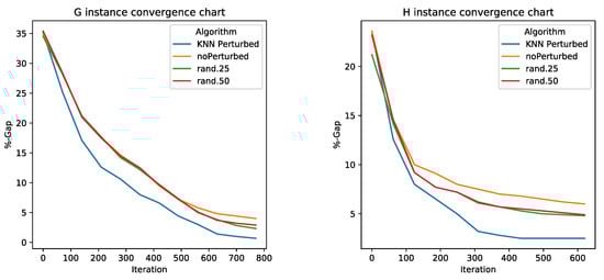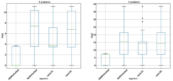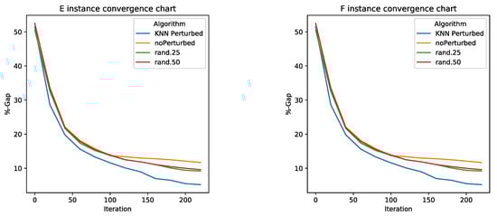 In Table 2, it is observed for the indicator best value that KNN perturbed algorithm was the one that obtained the best values in all instances. Rand.25 and rand.50 got similar values, and the non-perturbed algorithm got the worst values. In the case of the average indicator, the result is similar to the previous one. Again, the KNN perturbed algorithm obtained the best results, subsequently followed by rand.25, with non-perturbed being the one that once again obtained the worst value. The Wilcoxon test indicates that the difference between the algorithms is statistically significant. In the case of the box plots shown in Figure 2 and Figure 3, KNN perturbed obtains the best interquartile range values, with values closer to 0 in all instance types, when comparing it with the other algorithms. In addition, almost in all cases IQR (IQR = Q3–Q1) is smaller than in the case of the other algorithms, except in instances E and F in which it has values are very similar to rand.25. Finally, in Figure 4 and Figure 5, the convergence curves for the 4 types of instances studied are compared. In the 4 types, we observe that the shape of the convergence charts stabilizes in the same number of iterations for the different algorithms. However, in the first iterations, KNN perturbed is separated from the other algorithms, obtaining GAPslower than the rest, and this difference is maintained during the complete execution of the optimization.