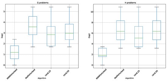 This section aims to describe the experiments that evaluate the contribution of the KNN perturbation operator in the final result of the optimization. Once the experiments are detailed, the results will be presented and analyzed. To evaluate the contribution of the KNN perturbation operator, two algorithms were designed. In the first one, the KNN perturbation operator is replaced by a random perturbation operator. This random operator also uses a perturbation coefficient but does not consider the information provided by the KNN perturbation analysis module. The perturbation is executed in a random way, in the same way, that the are perturbed in Algorithm 3. For this random perturbation operator, 2 values of , 25, and 50 were used and its algorithms are denoted by , and , respectively. The first value used, is the same one used by the KNN perturbation operator.