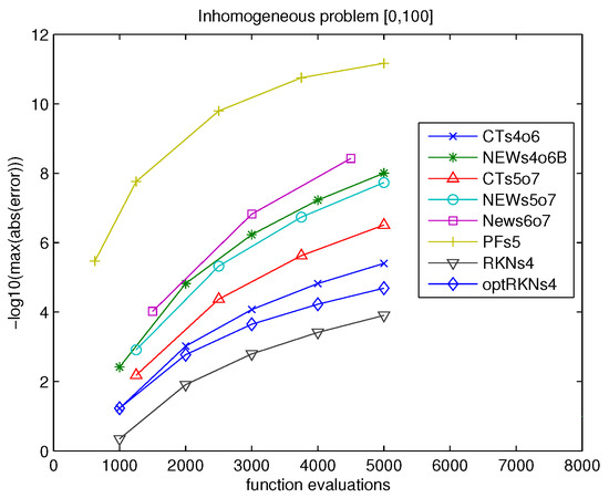 For this problem we use . In Figure 3 we present the maximum absolute error of the solution in the interval , we see that the new methods produce less absolute error.