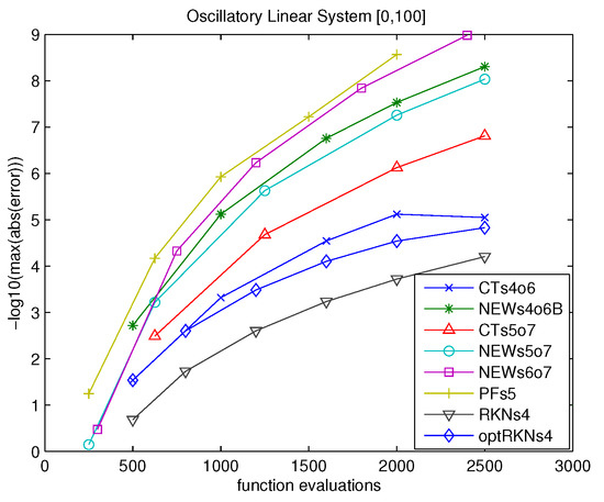 - Simos, T.E.; Tsitouras, C. Explicit, ninth order, two step methods for solving inhomogeneous linear problems x(t) = Λx(t) + f(t). Appl. Numer. Math. 2020, 153, 344–351. [Google Scholar] [CrossRef]